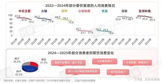 根据红餐大数据显示,2024 年全国餐饮人均消费降至39.8元,同比下降6.6%。在各细分领域中,饮品赛道的人均消费下降幅度最为明显,降幅达到13.9%,中式正餐、火锅、烧烤、小吃快餐等其他细分赛道的人均消费也均有不同幅度的下降。